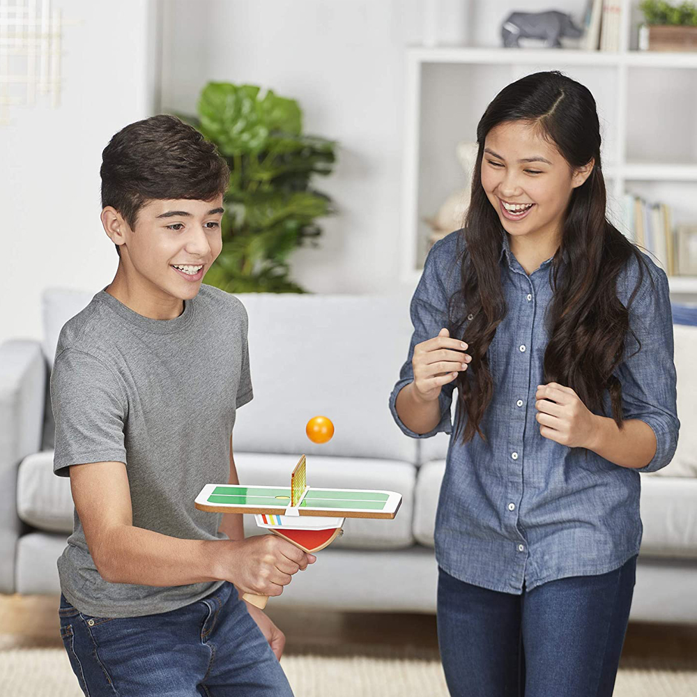 The Hasbro Tiny Pong Solo table tennis game brings exciting bouncing action into the palm of your hand! Launch the ball off the court and bounce it repeatedly on the court to rack up points. Move the court back and forth under the ball. Keep it going, getting a point for every bounce. To increase the challenge, switch from beginner mode to expert mode. The game responds with lights and sounds as players try to beat their highest score by getting as many bounce as they can! How long can you keep it going? Hasbro gaming and all related terms are trademarks of Hasbro. Includes Hasbro Tiny Pong court surface, handle, net, ball, and instructions. Ages 8 and up. For 1 or more players.